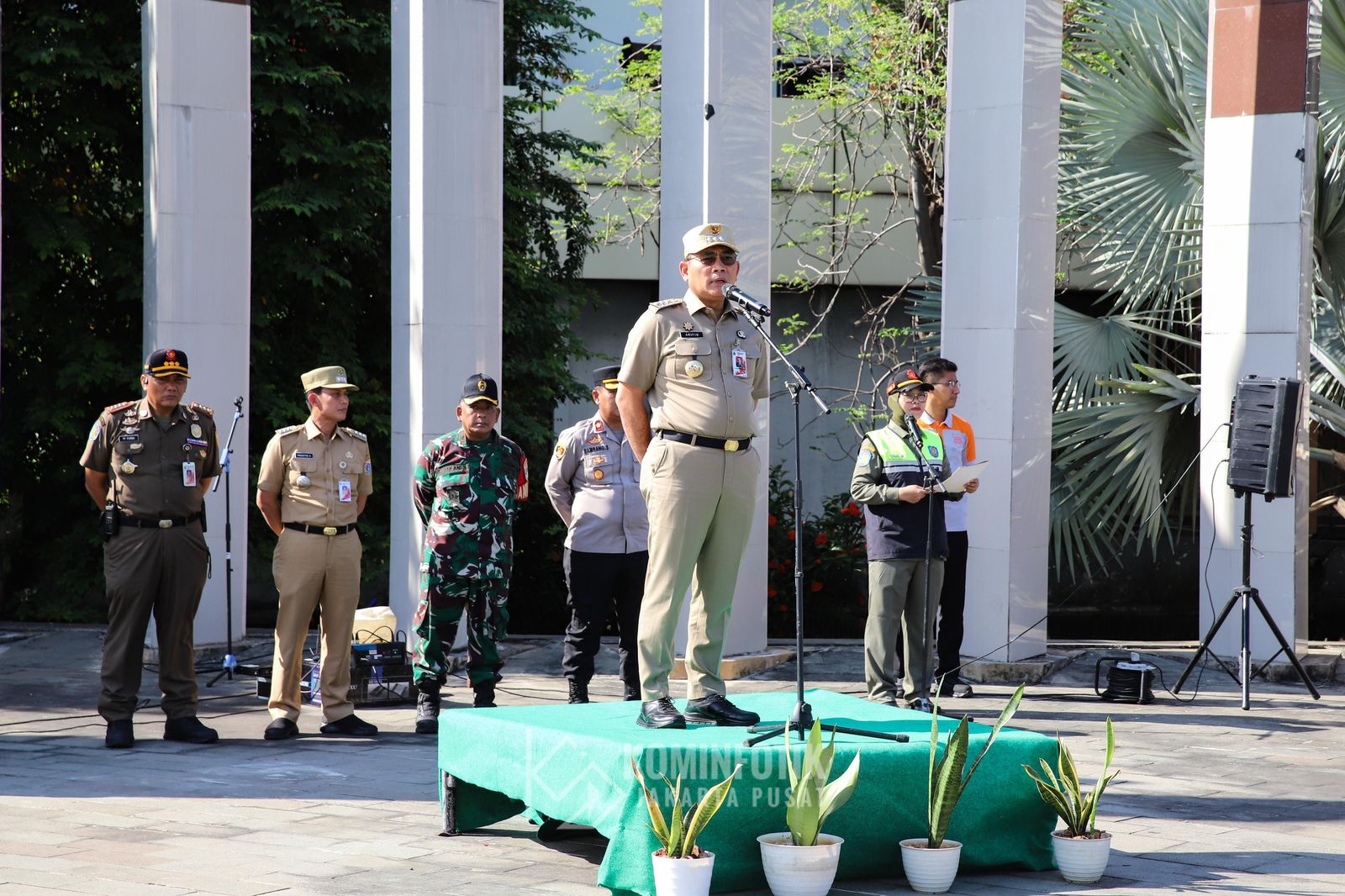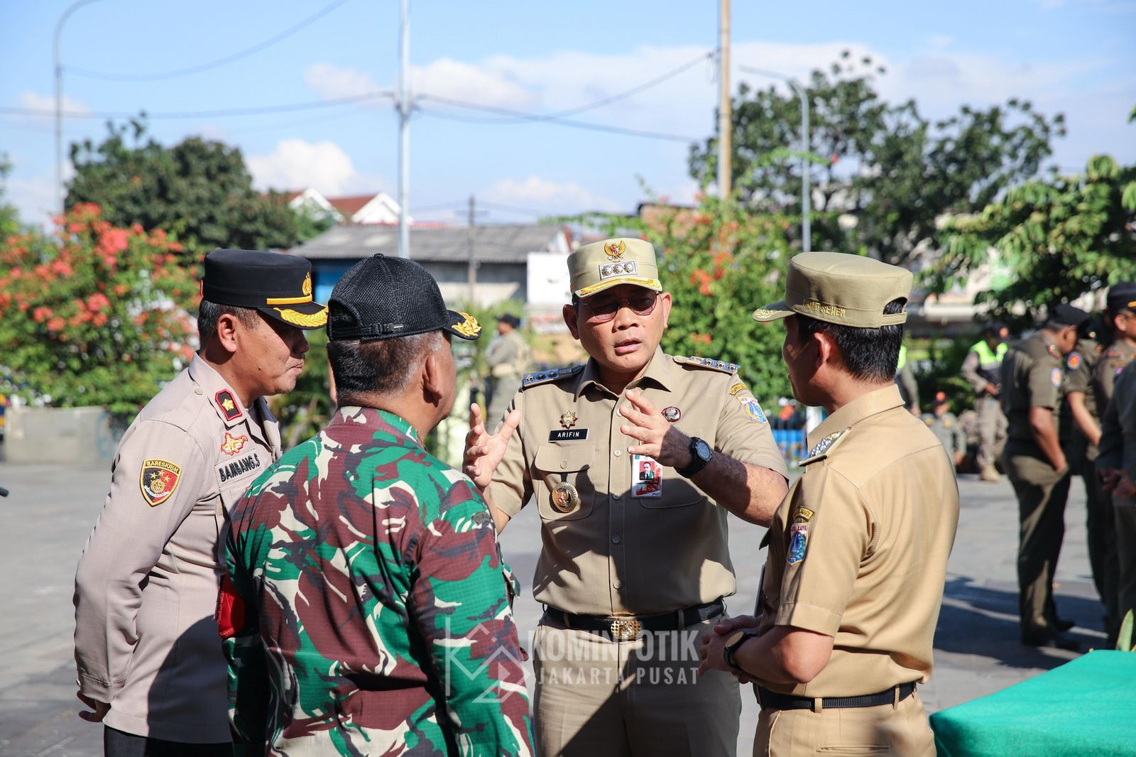 Walikota Administrasi Jakarta Pusat Arifin memimpin apel pengarahan dan pengecekan personel dalam rangka penataan kawasan serta penertiban pedagang Pasar Senen juga parkir liar di Taman Hari Kesetiakawanan Sosial Nasional (HKSN) Jalan Pasar Senen, Kecamatan Senen, Selasa (11/3)