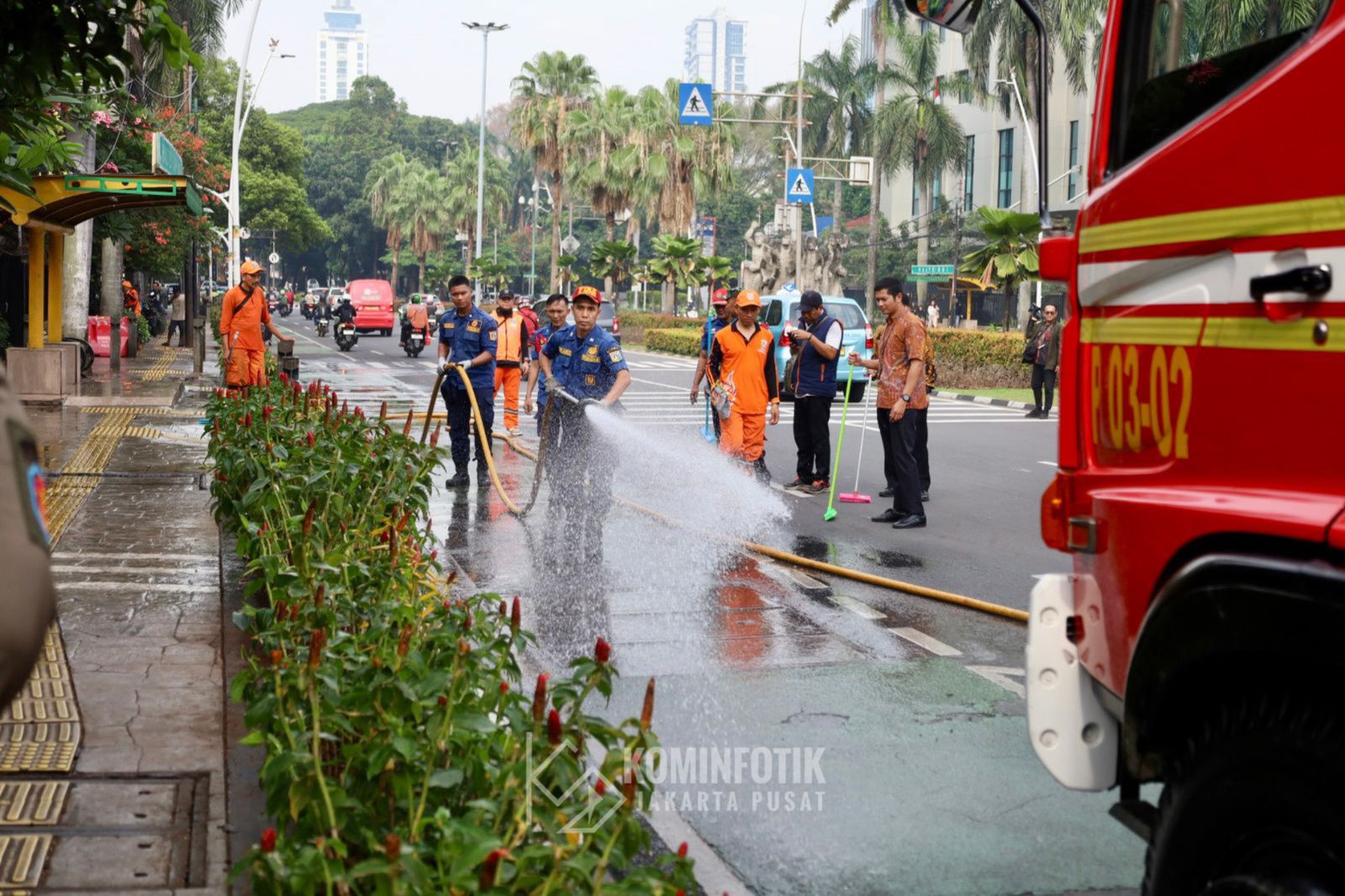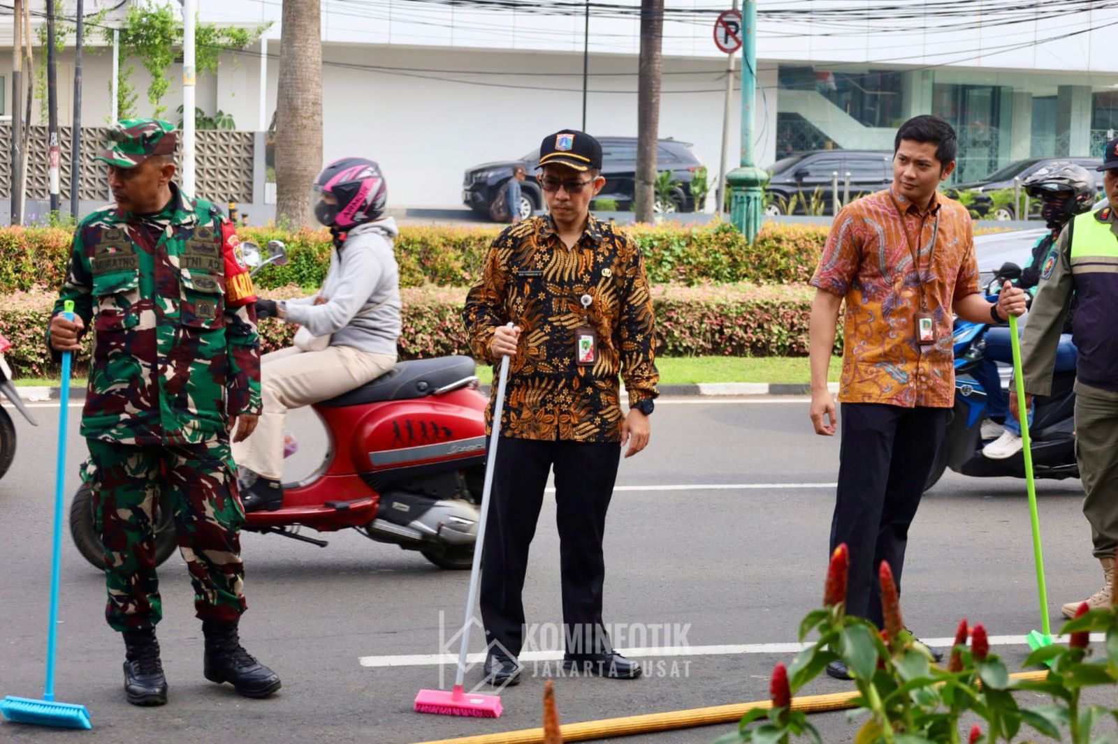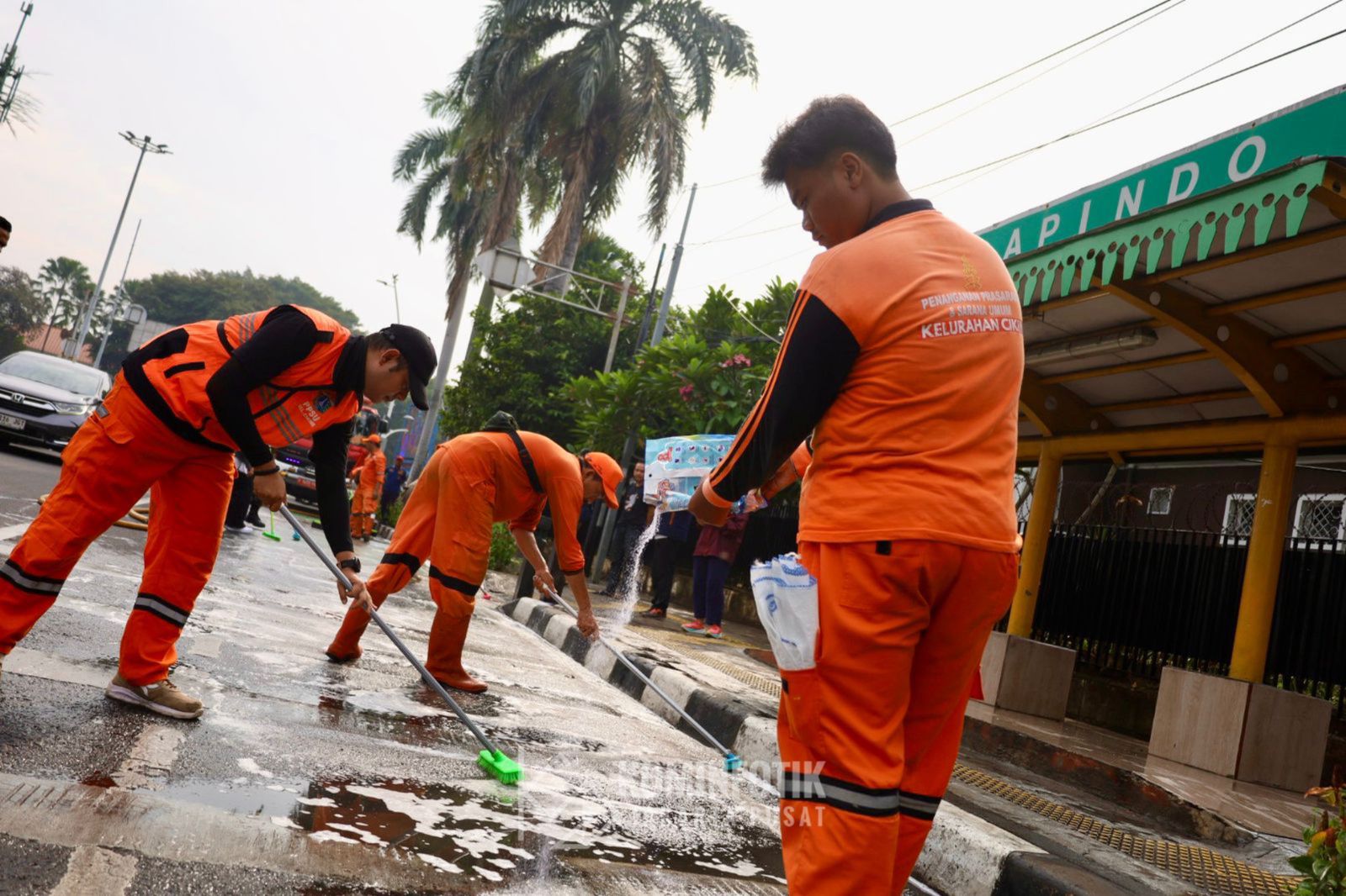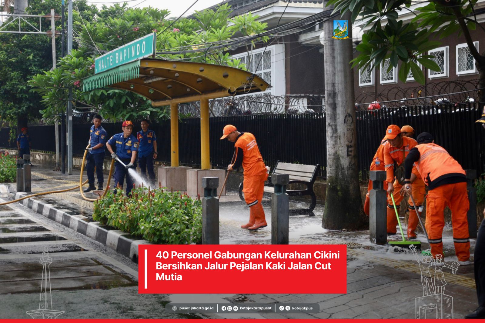 40 Personel Gabungan Kelurahan Cikini Bersihkan Jalur Pejalan Kaki Jalan Cut Mutia
