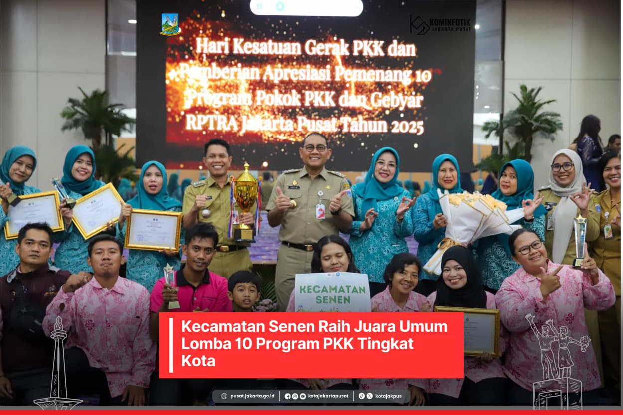 Kecamatan Senen berhasil meraih Juara Umum dalam lomba 10 Program Pemberdayaan Kesejahteraan Keluarga (PKK) Tingkat Kota.