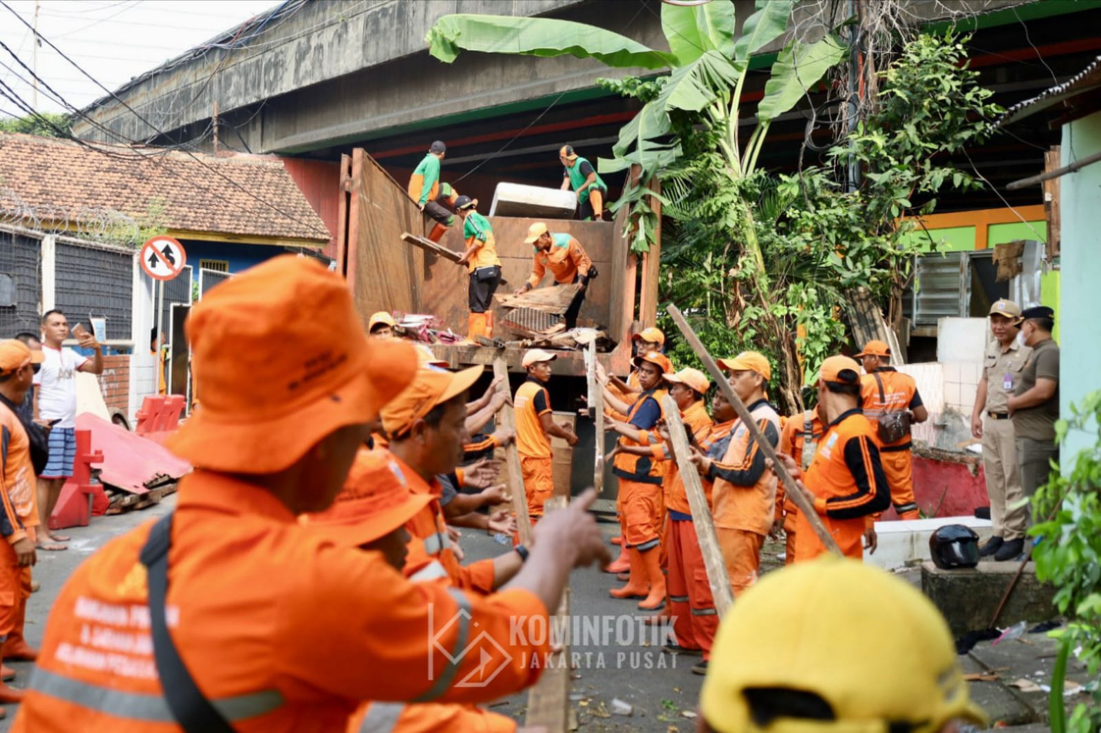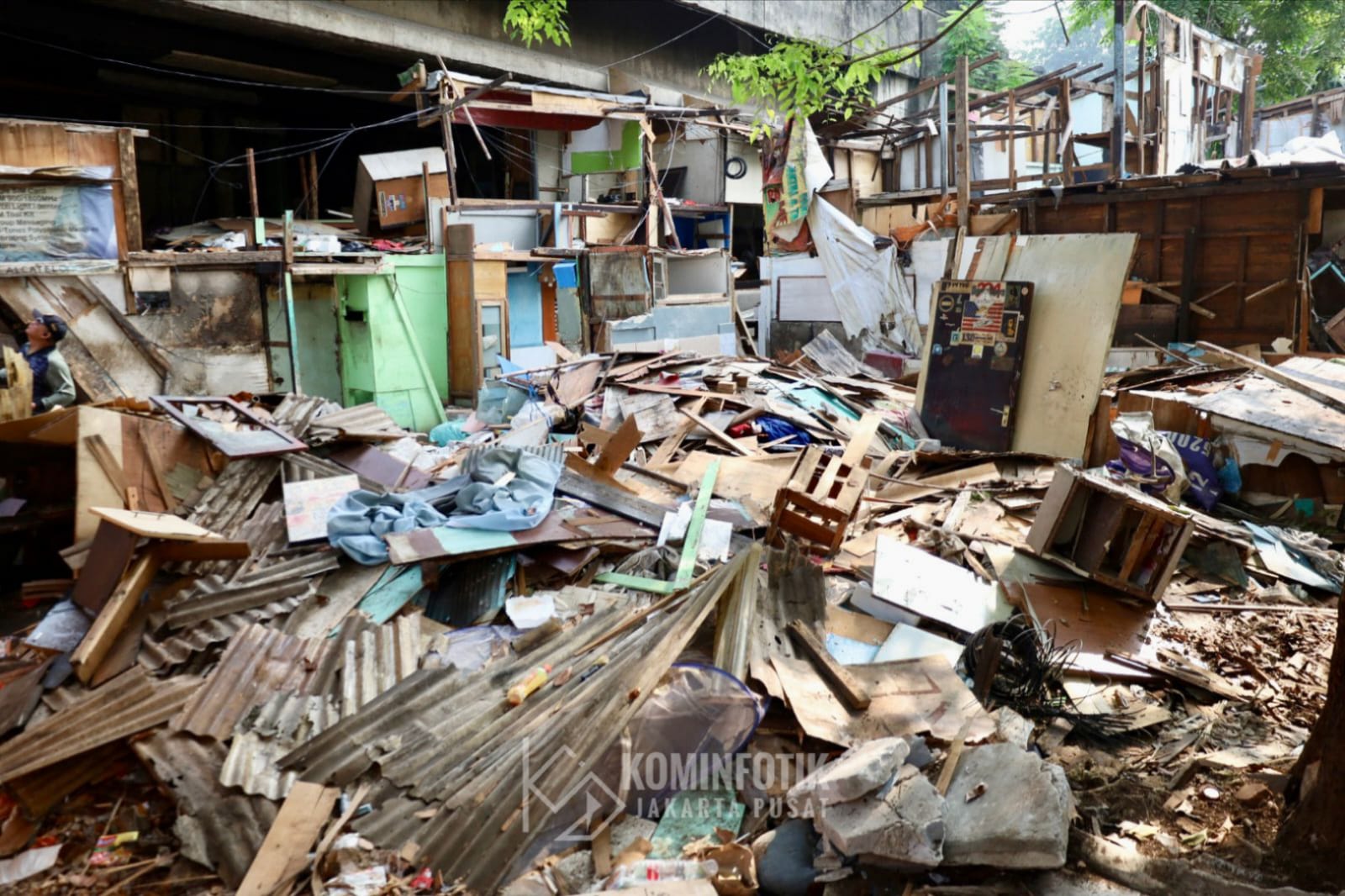 Pemerintah Kota (Pemkot) Administrasi Jakarta Pusat melakukan kerja bakti pembersihan dan pembongkaran bangunan bekas lokasi penghuni Kolong Flyover Tanjung Selor, Jalan Tanjung Selor, Kelurahan Cideng, Kecamatan Gambir.