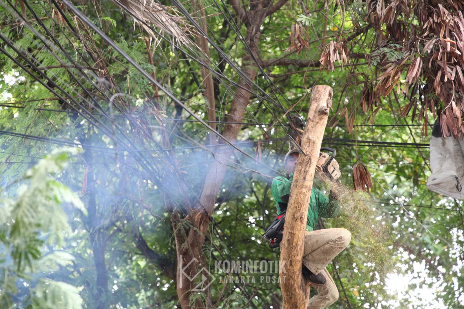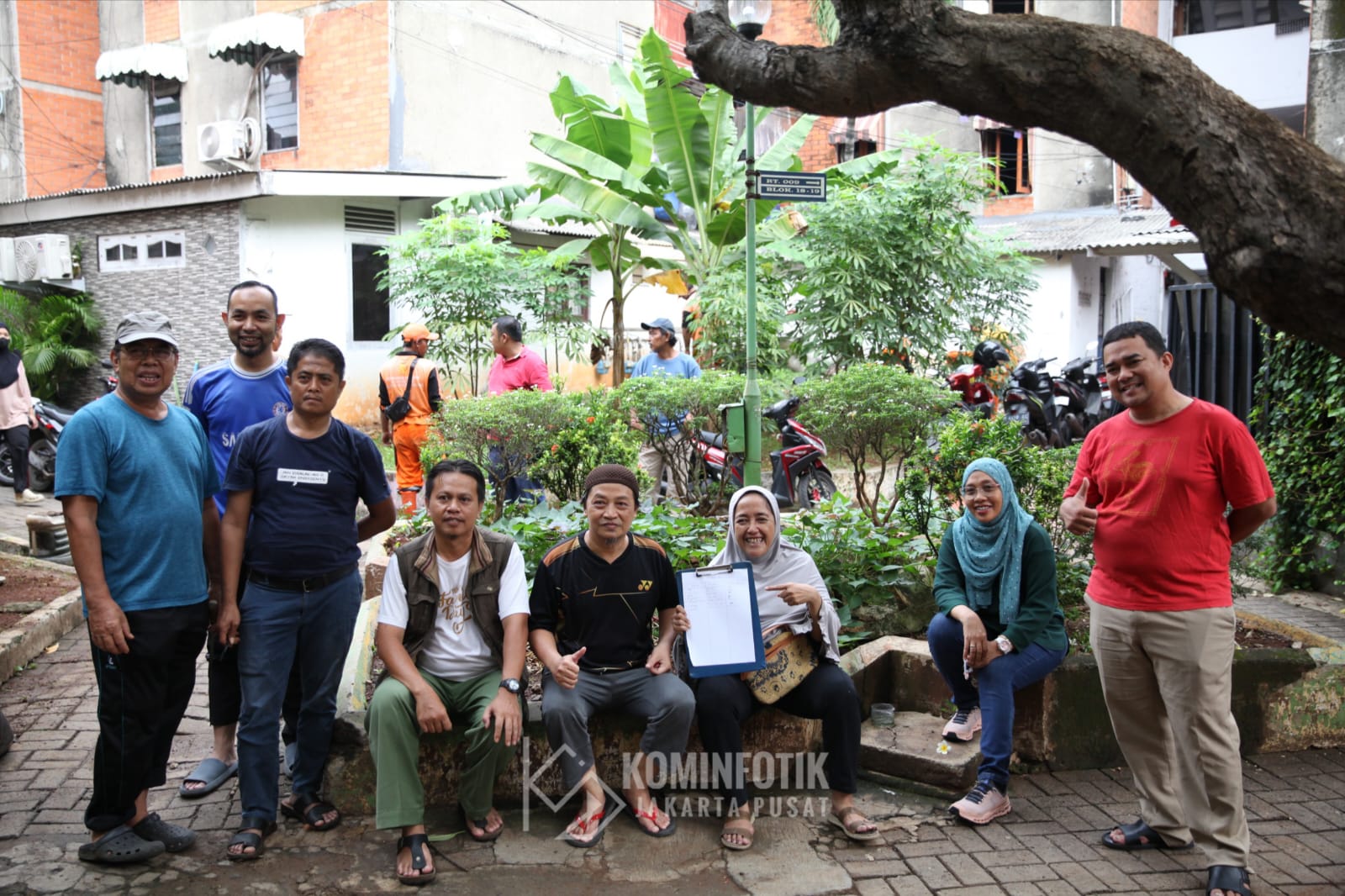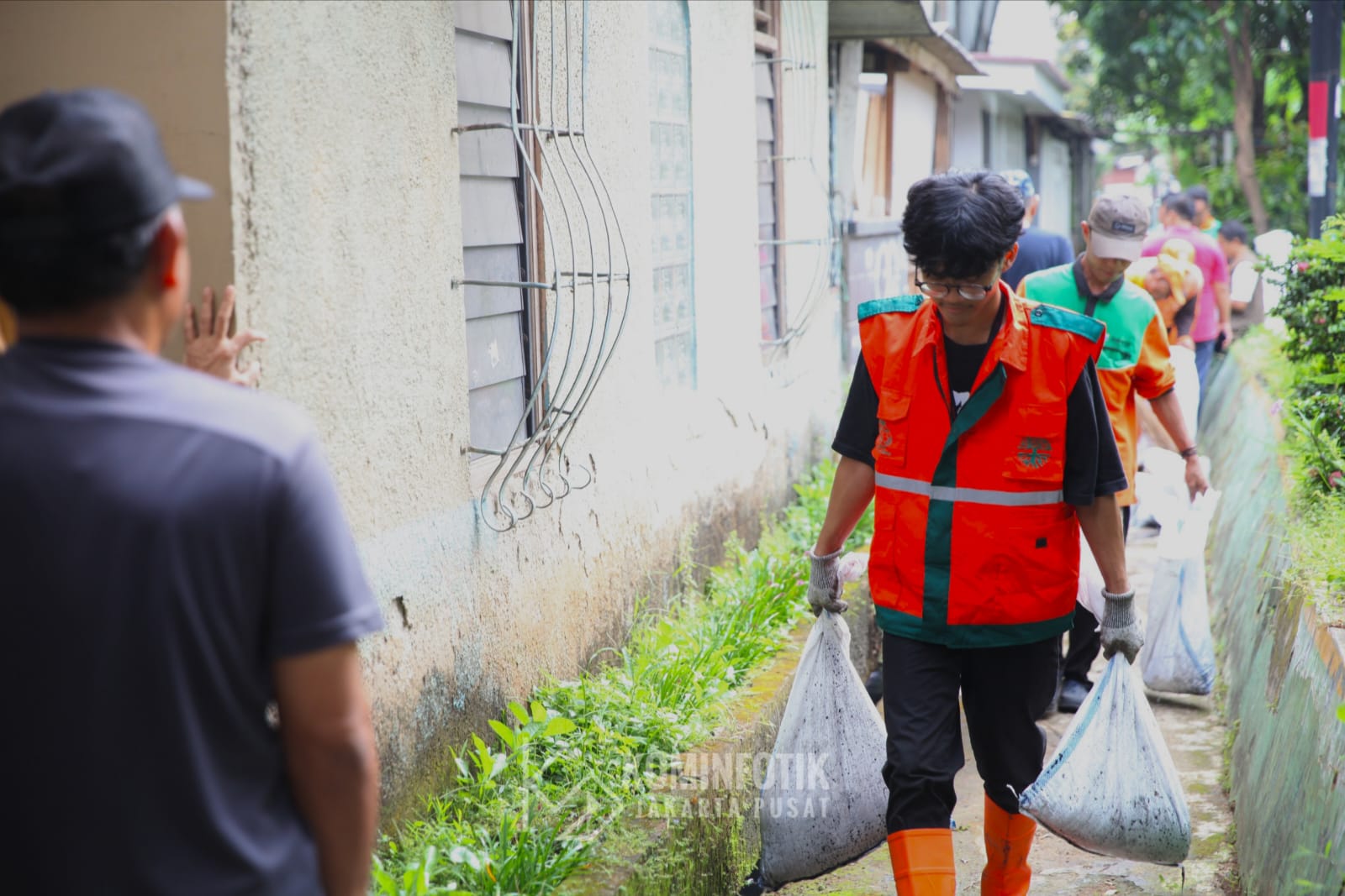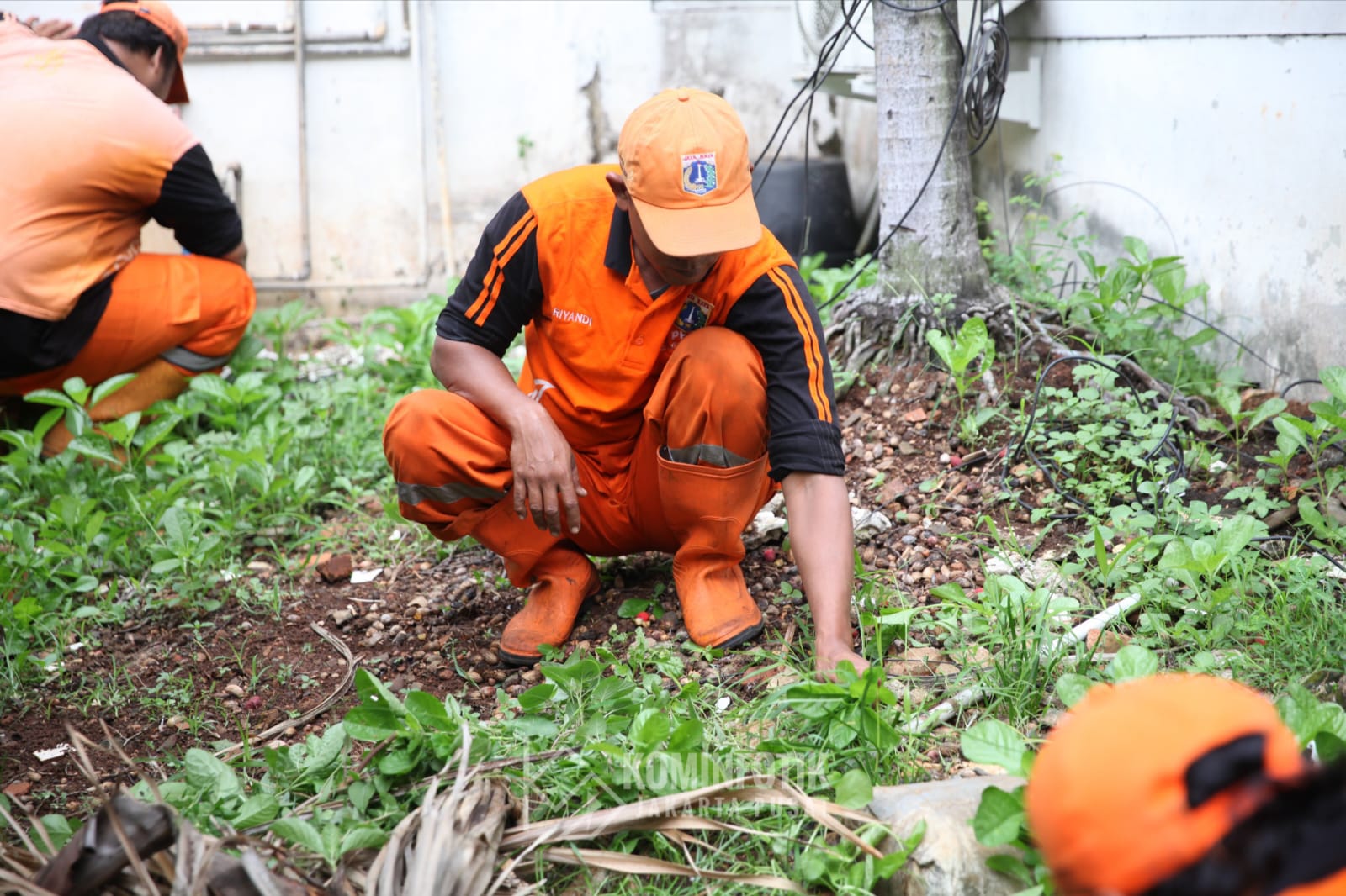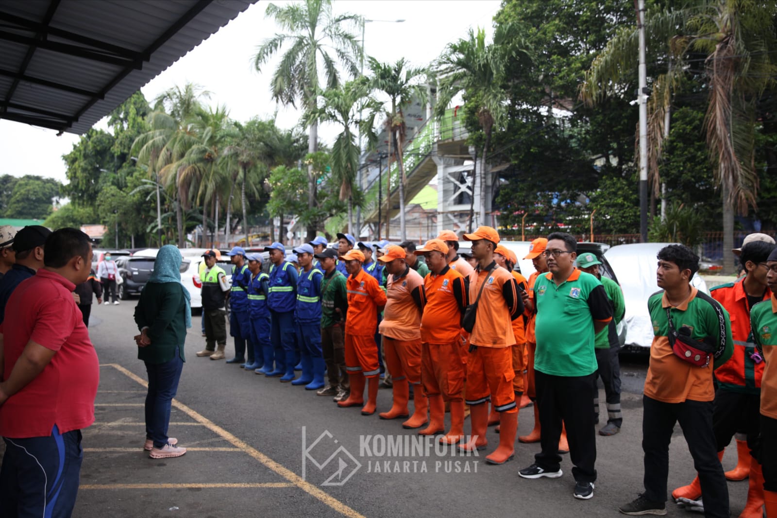 Petugas gabungan Kelurahan Kebon Kacang melaksanakan kegiatan kerja bakti gerebek lumpur, di Rusun Tanah Abang, Jakarta Pusat, Minggu (23/11).