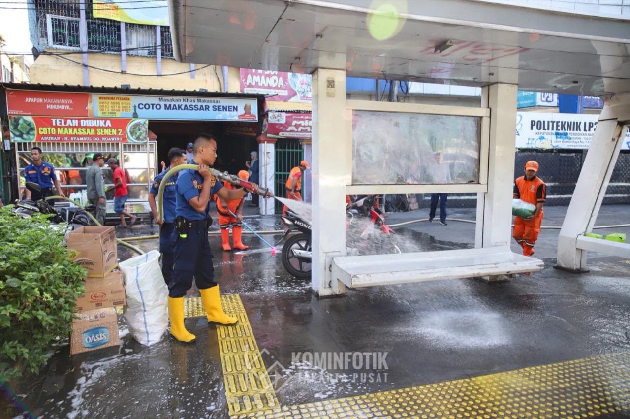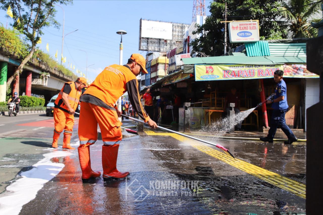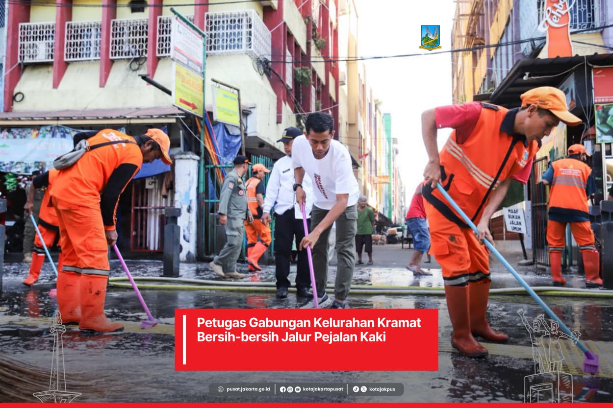 Petugas Gabungan Kelurahan Kramat melakukan pembersihan jalur pejalan kaki di sepanjang Jalan Kramat Raya, Jumat (5/12).