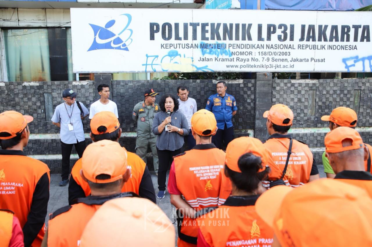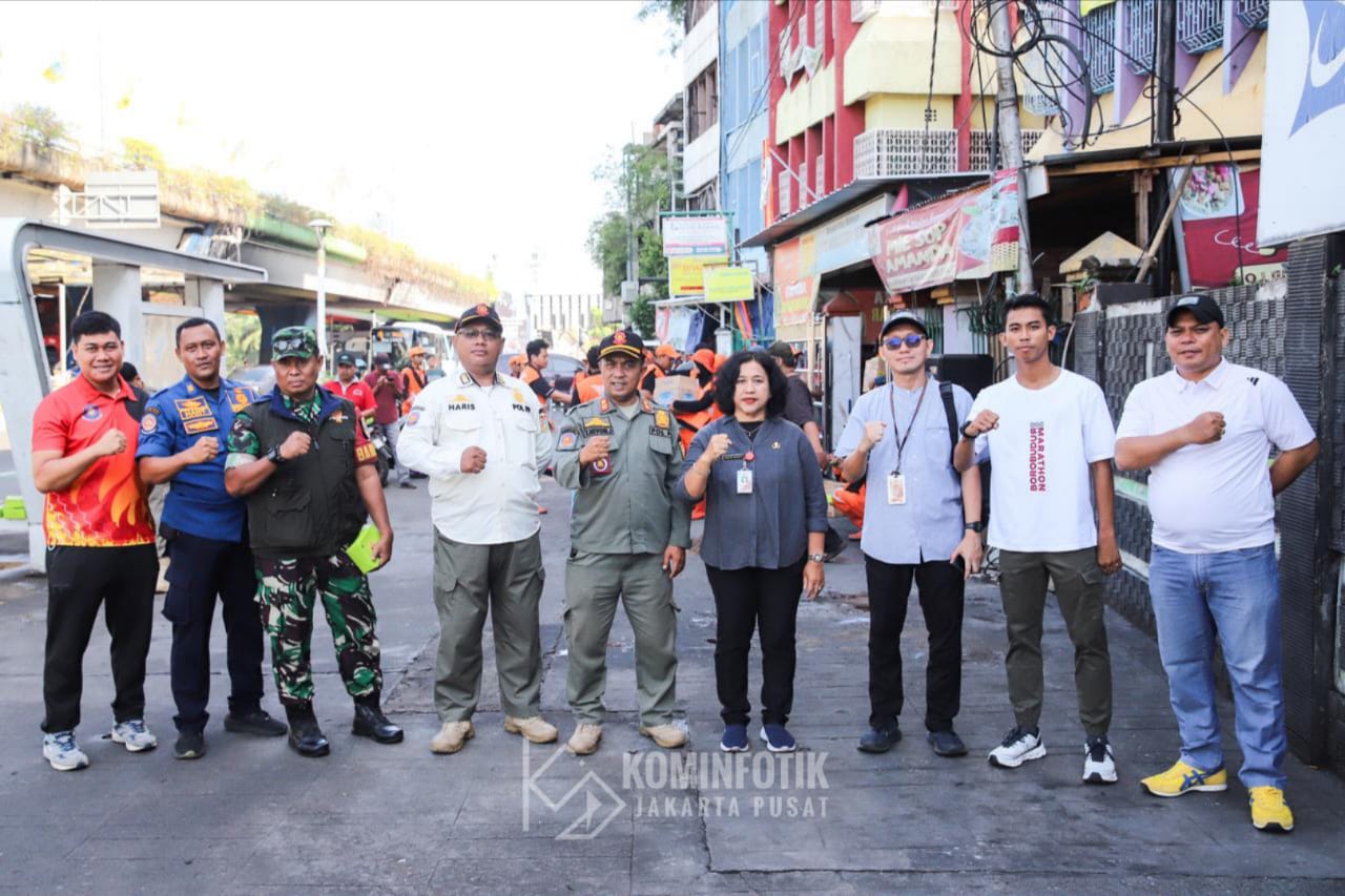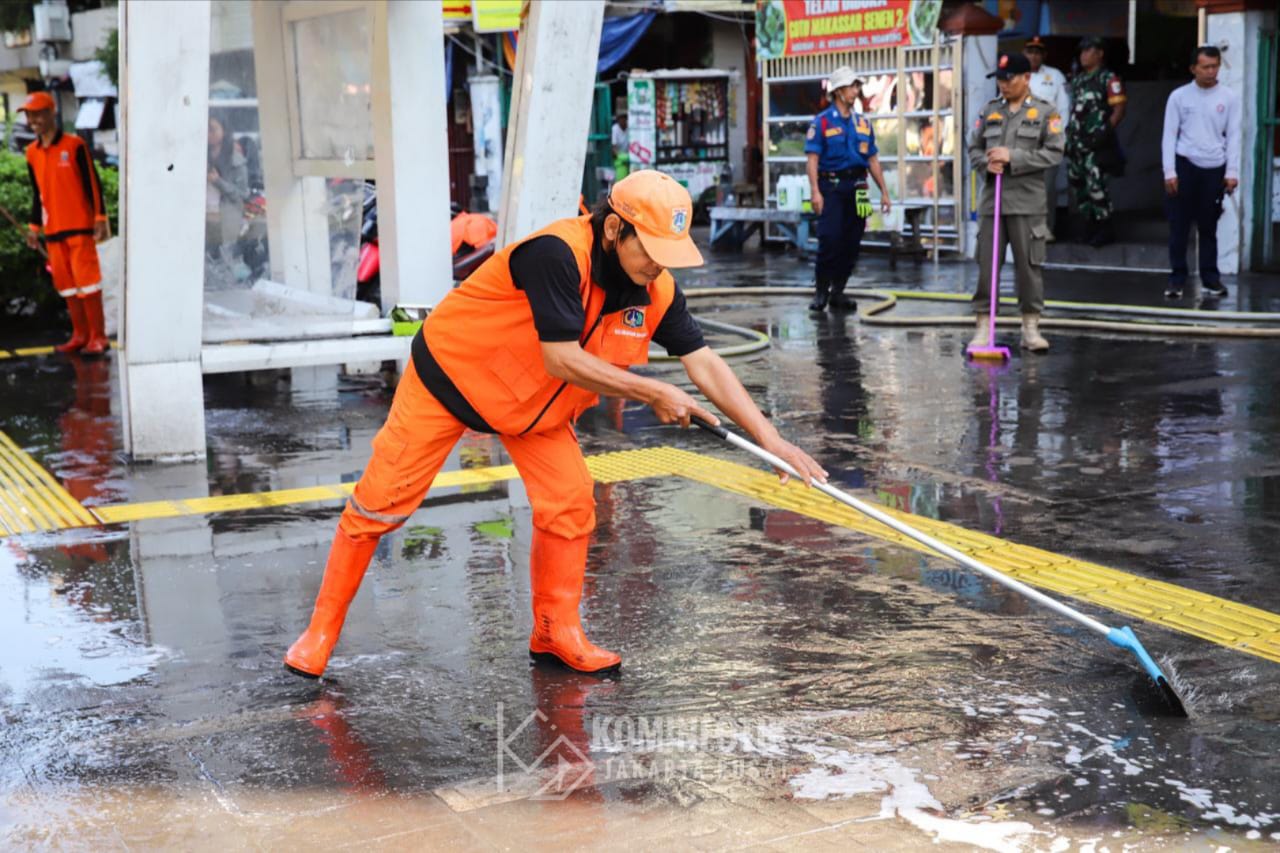 Petugas Gabungan Kelurahan Kramat melakukan pembersihan jalur pejalan kaki di sepanjang Jalan Kramat Raya, Jumat (5/12).