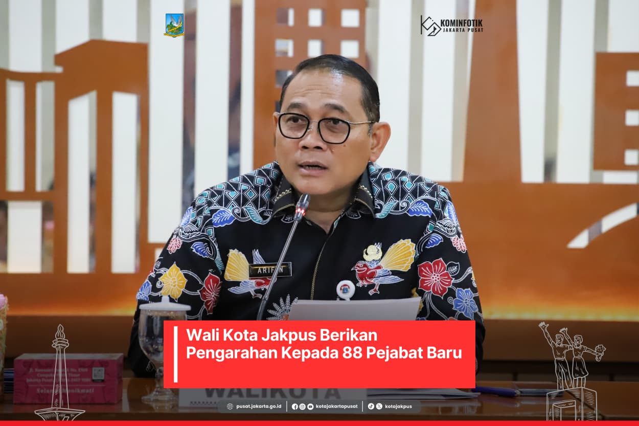 Wali Kota Administrasi Jakarta Pusat Arifin memberikan pengarahan kepada 88 pejabat administrator dan pengawas baru ataupun yang mendapatkan rotasi di Ruang Pola Lt 1 Kantor Walikota Jakarta Pusat, Jl Tanah Abang I, Gambir, Kamis (6/11)