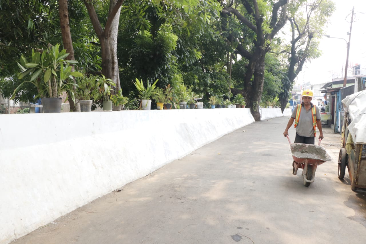 Kepala Suku Dinas Sumber Daya Air (Kasudin SDA) Kota Administrasi Jakarta Pusat Mustajab meninjau progres pembangunan dinding parapet (pembatas atau penghalang) Kali Krukut, di RW 04, Kelurahan Kar...